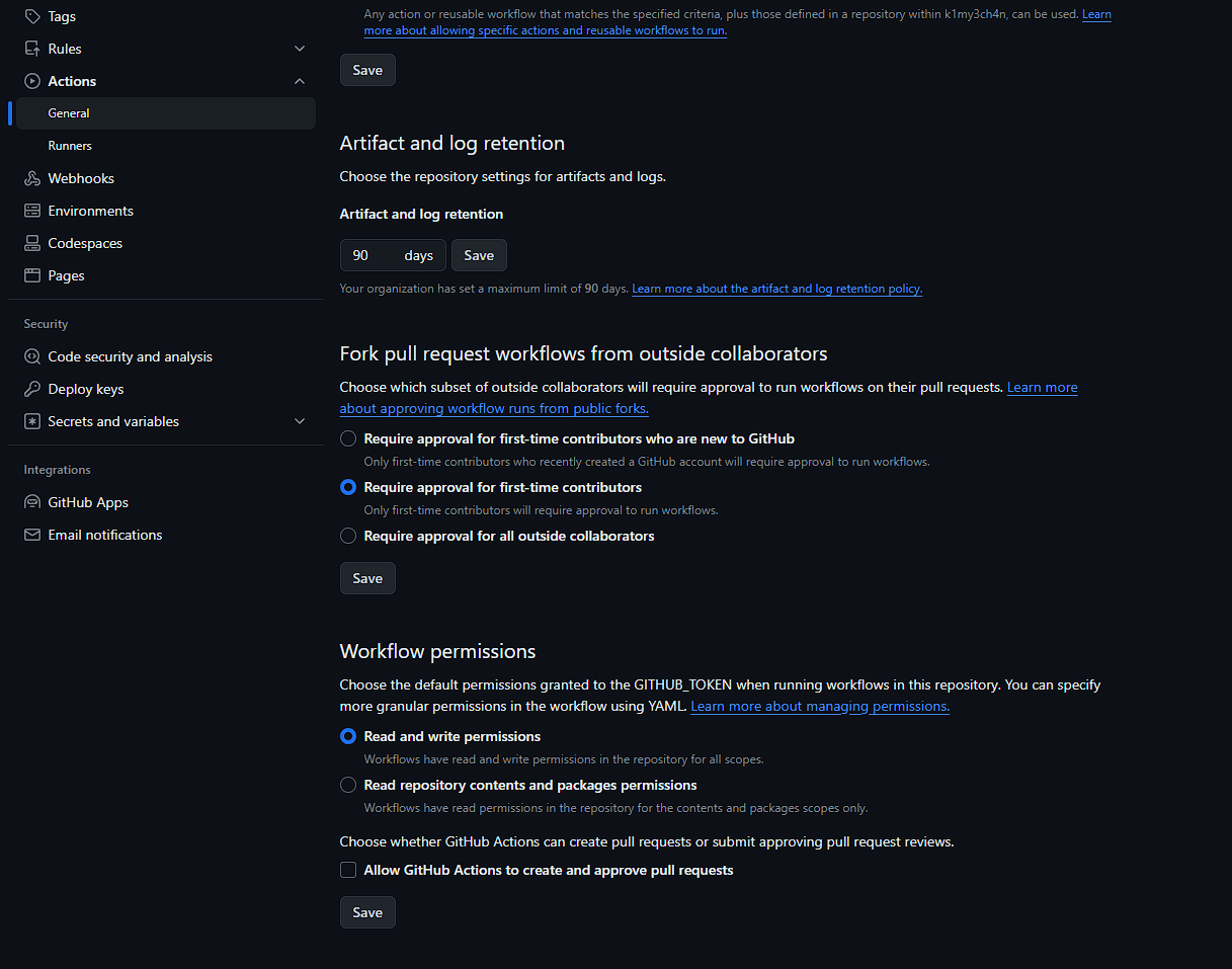 ๋ฐ๋ผ์ settings > actions > general > Workflow permissions ์์ Read and write permissions ์ ์ ํํด์ค๋ค.