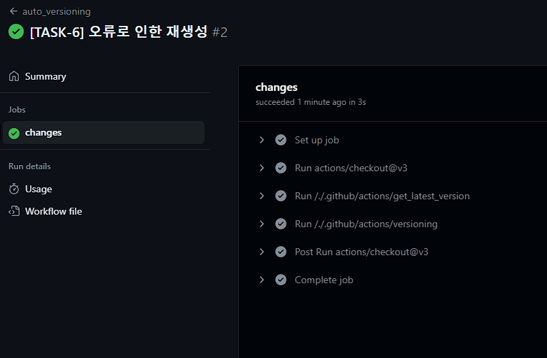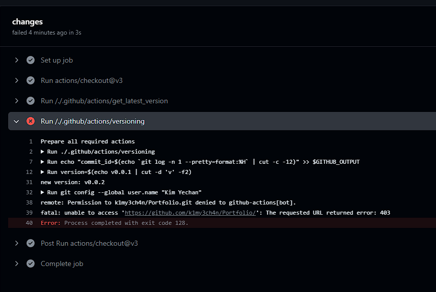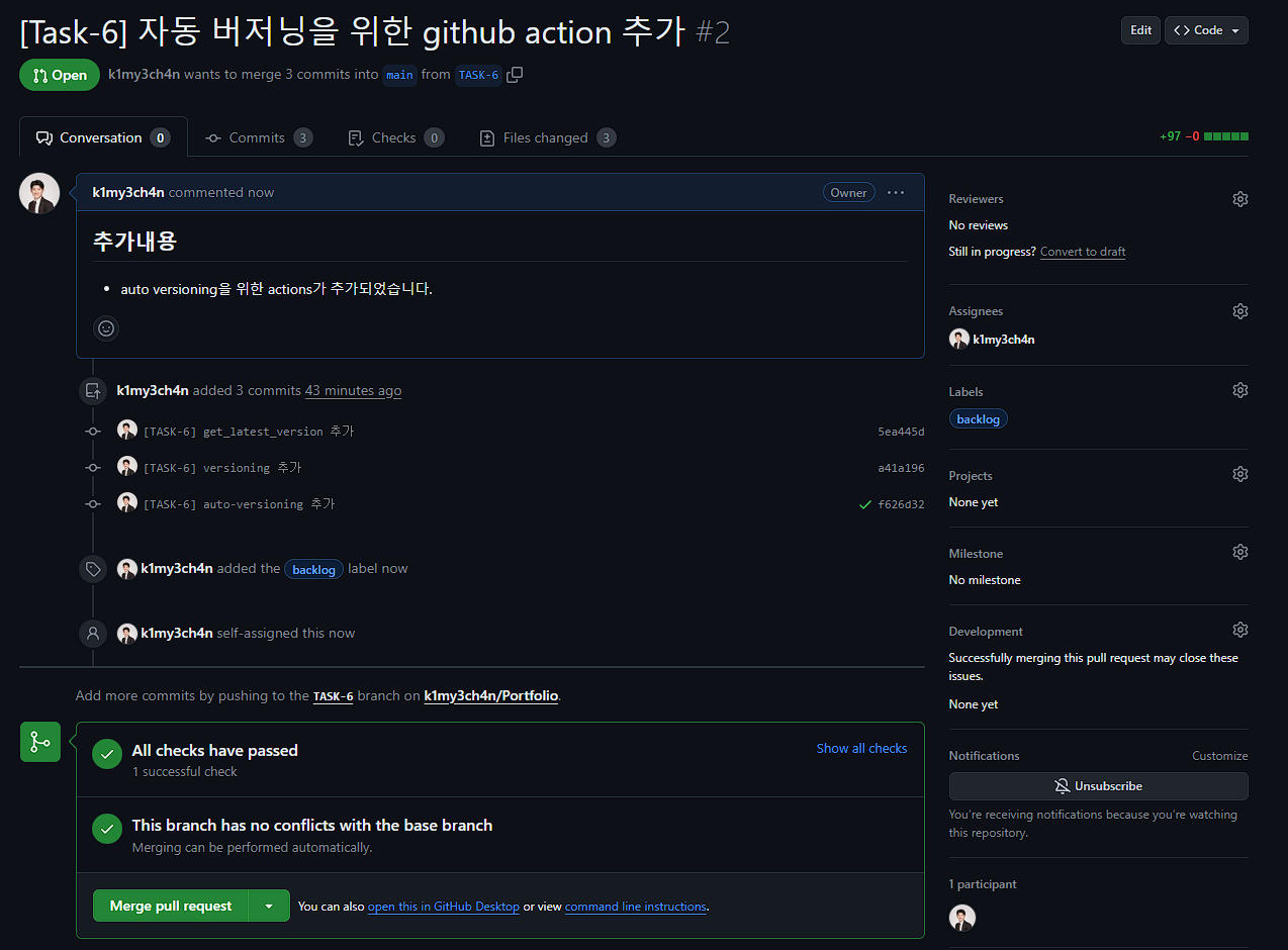 get-tags : ์์ค์ฝ๋๋ฅผ ๊ฐ์ ธ์ค๊ธฐ ์ํด checkout์ ์งํํ๋ค. ์ด๋ , fetch-depth: 0 ์ผ๋ก ๋ชจ๋ ๊ธฐ๋ก์ ๊ฐ์ ธ์จ๋ค. ์ถ๊ฐํ์ง ์์ผ๋ฉด , ๊ฐ์ฅ ์ต๊ทผ ์ปค๋ฐ๋ง ๊ฐ์ ธ์จ๋ค.get-latest-version : ์์์ ๋ง๋ get_latest_version ๋ฅผ ์ฌ์ฉํด์ ์ต๊ทผ ๋ฒ์ ์ ๊ฐ์ ธ์จ๋ค.versioning : ๋ณ์๋ค๊ณผ ํจ๊ป ๋ฒ์ ๋์ ์งํํ๋ค. ์ผ๋จ์ patch ๋ฒ์ ๋ง ์ฆ๊ฐ์ํค๊ธฐ ์ํด์ segment ์ patch๋ฅผ ๋ฃ์ด์ฃผ๊ณ , ์ด์ ๋ฒ์ ๊ณผ description ๋ ์ถ๊ฐํด์ค๋ค.์ ๋ณ๊ฒฝ์ฌํญ์ push ํ , pr ์ ์์ฑํ๋ค.