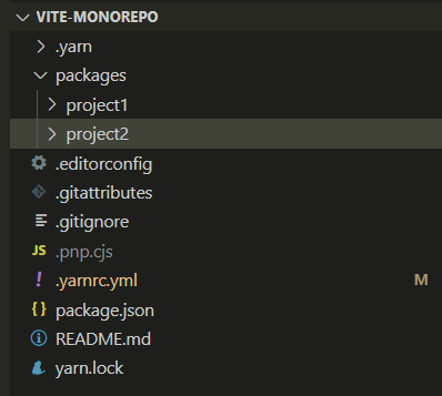 ๋๋ค. ๋ฐ๋ผ์ packages ํด๋ ์์ฑ ํ , ๊ทธ ์์monorepo ๋ก ์ฌ์ฉํ ํ์ผ๋ค์ ์ถ๊ฐํฉ๋๋ค. ์ ๋ project1 , project2 ๋ฅผ vite๋ก ์ถ๊ฐํ์ต๋๋ค.