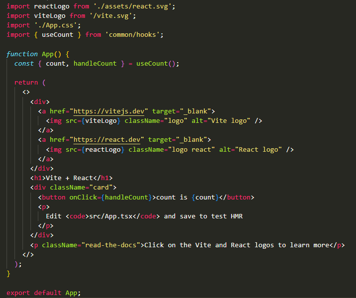 ๊ธฐ๋ณธ์ ์ผ๋ก ์ฌ์ฉ๋๋ hook ๊ณผ component ๋ฅผ ์์ฑํฉ๋๋ค. ๊ธฐ๋ณธ์ ์ผ๋ก yarn create vite ๋ฅผ ์ฌ์ฉํด์ ์์ฑํ๋ฉด , ๋ฒํผ๊ณผ ๊ทธ ๋ฒํผ์ ๋๋ ์ ๋ count๊ฐ ์ฆ๊ฐํ๋ ์ฝ๋๊ฐ ์์ฑ๋ฉ๋๋ค. ์ฌ๊ธฐ์ ๋ฐ๋ผ์ ๊ธฐ๋ณธ Button component ์ count ๋ฅผ ์ฆ๊ฐ์ํค๋ useCount hook ์ ์์ฑํด ๋ณด๊ฒ ์ต๋๋ค.