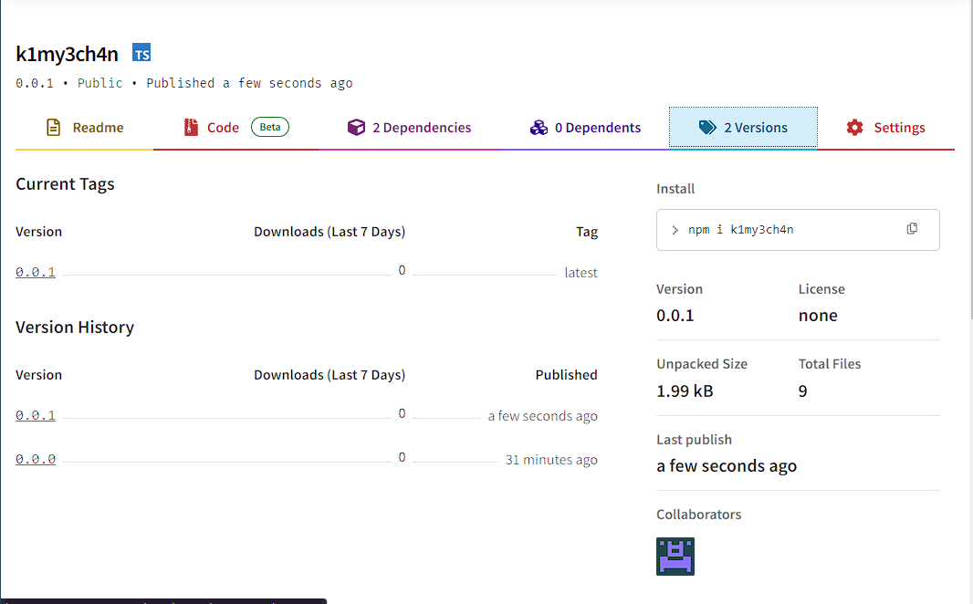 ๋ง์ฝ ์ด๋ฏธ publish ๋์ด์๋ ์ด๋ฆ์ด๋ผ๋ฉด , ์ด์ฒ๋ผ ๊ทธ package์ ๋ํ ์ ๋ณด๊ฐ ๋์จ๋ค.