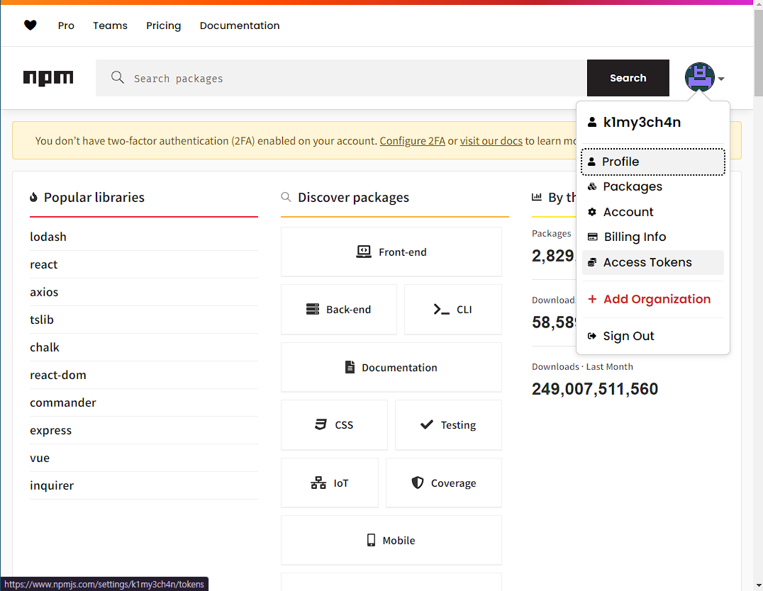 NPM ์ ๋ฐฐํฌํ๊ธฐ ์ํด์๋ NPM ์์ด๋์ ํ ํฐ์ด ํ์ํฉ๋๋ค.