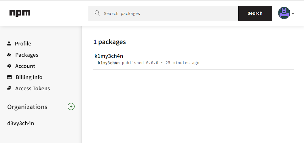 ์ด๋ฐ์์ ๋ฉ์์ง๊ฐ ๋ฑ์ฅํ๋ฉด ์ฑ๊ณต์ด๋ค. npm ์์ ๋ณธ์ธ package ํ์ธํด๋ณด๋ฉด